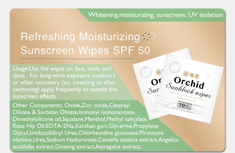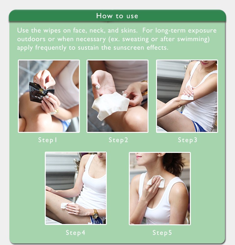 Use the wipes on face, neck, and skins. For long-term exposure outdoors or when necessary (ex. sweating or after swimming) apply frequently to sustain the sunscreen effects.