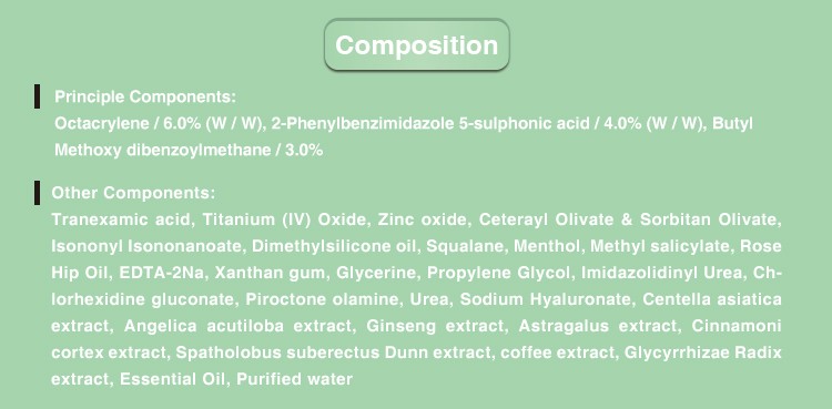 Tranexamic acid, Titanium(IV) Oxide, Zinc oxide, Cetearyl Olivate & Sorbitan Olivate, Isononyl Isononanoate, Dimethyl Silicone oil, Squalane, Menthol, Methyl salicylate, Rose Hip Oil, EDTA-2Na, Xanthan gum, Glycerine, Propylene Glycol, Imidazolidinyl Urea, Chlorhexidine gluconate, Piroctone olamine, Urea, Sodium Hyaluronate, Centella asiatica extract, Angelica acutiloba extract, Ginseng extract, Astragalus extract, Cinnamomi cortex extract, Spatholobus suberectus Dunn extract, coffee extract, Glycyrrhizae Radix extract, Essential Oil, Purified water